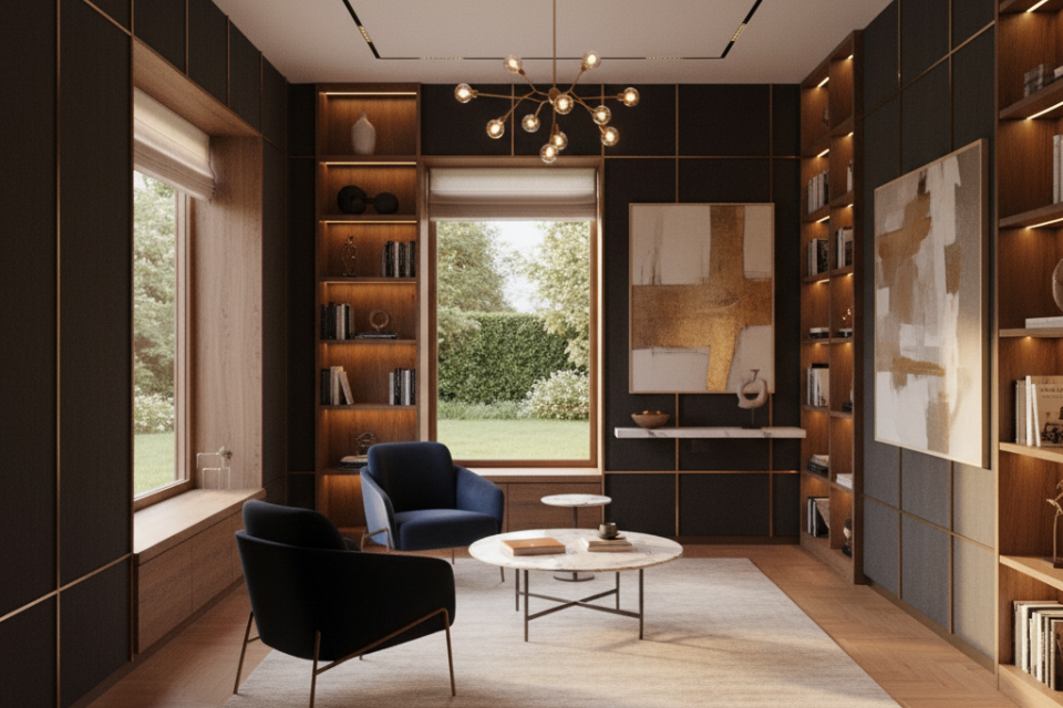 Gunakan pencahayaan 3000K–3500K (warm white) agar atmosfer rileks.