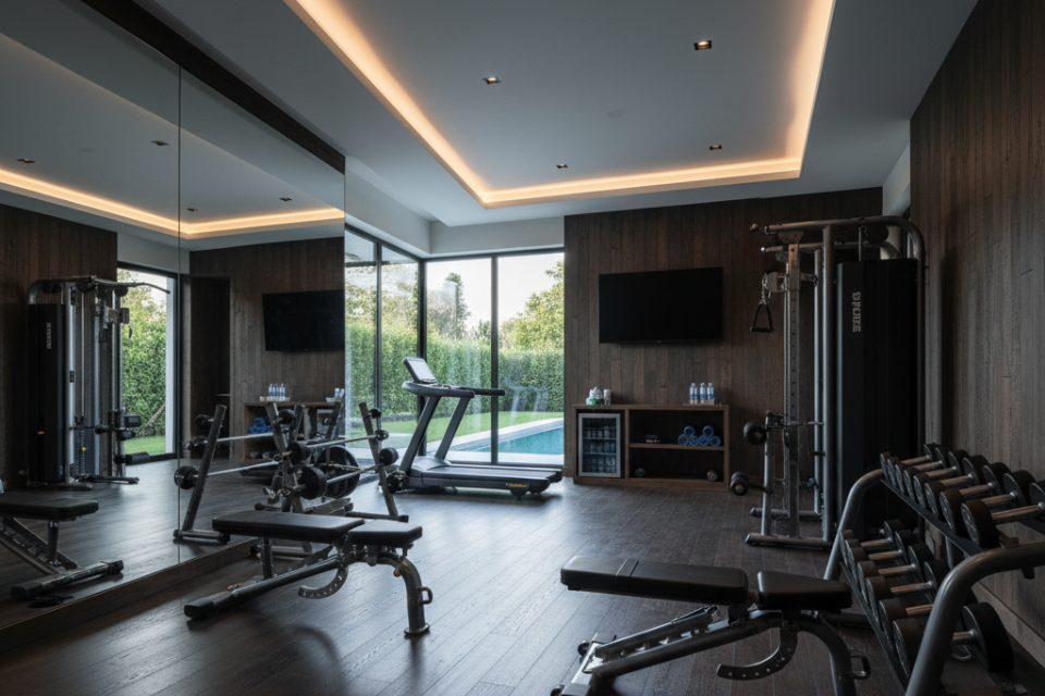 Fungsi: gym pribadi, yoga area, atau ruang olahraga ringan.